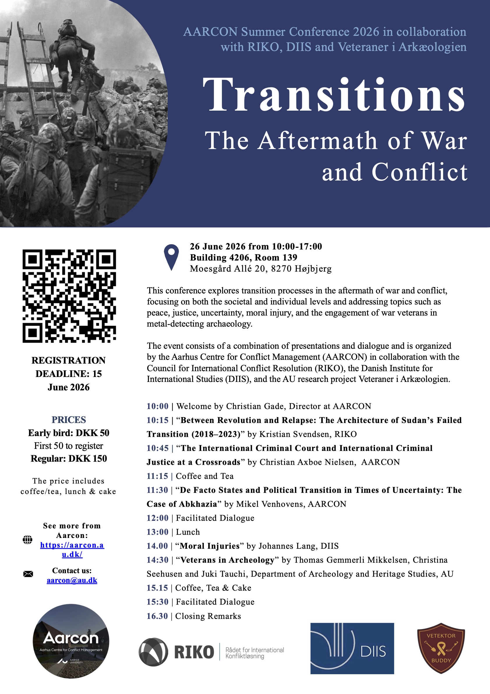 On June 26, 2026, the Aarhus Centre for Conflict Management (Aarcon) will host the Conference “Transitions: The Aftermath of War and Conflict.” This Conference explores transition processes in the aftermath of war and conflict, focusing on both the societal and individual levels and addressing topics such as peace, justice, uncertainty, moral injury, and the engagement of war veterans in metal-detecting archaeology.